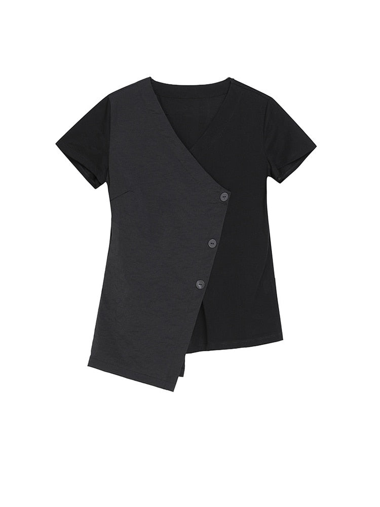 Introducing the Primii Button Wrap Shirt - the perfect choice to make a statement while keeping it classy. Featuring a diagonal, asymmetrical button detail, this sleek black shirt keeps you looking sharp and modern without sacrificing comfort. Dress it up or dress it down - either way, you'll be perfectly polished!
